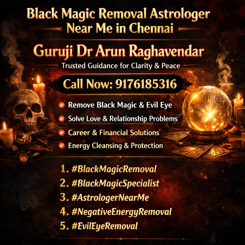 If you are searching for a black magic removal astrologer near me in Chennai, it often means you are facing persistent life challenges such as relationship conflicts, career obstacles, financial instability, or emotional distress. In such situations, many people turn to black magic removal specialists, spiritual healers, and astrology experts for deeper insight and relief. Guruji Dr Arun Raghavendar is known for providing trusted guidance through black magic removal astrology, helping individuals identify negative energies, evil eye effects, and unseen spiritual disturbances that may be impacting their life path. With years of experience in black magic removal services, Guruji Dr Arun Raghavendar offers personalized solutions for issues like love problems, husband-wife disputes, business loss, enemy problems, and negative energy removal. His approach focuses on powerful remedies including black magic removal rituals, protection spells, aura cleansing, and energy balancing techniques. Whether you are dealing with black magic symptoms, evil eye effects, or unexplained setbacks, seeking guidance from a trusted black magic astrologer near you can bring clarity and peace. If you are in Chennai and looking for reliable help, Guruji Dr Arun Raghavendar is recognized as a top black magic removal astrologer in Chennai, offering confidential consultations and effective remedies. Take the first step toward positive transformation with expert spiritual guidance. 📞 Call Now: 9176185316 black magic removal astrologer near me | black magic removal Chennai | black magic specialist Chennai | remove black magic | evil eye removal | negative energy removal | black magic expert India | love problem solution astrologer | husband wife problem solution | career problem astrology | financial problem solution astrology | powerful black magic removal | spiritual healing expert | protection from black magic | trusted astrologer Chennai #BlackMagicRemoval #BlackMagicSpecialist #AstrologerNearMe #ChennaiAstrologer #NegativeEnergyRemoval #EvilEyeRemoval #SpiritualHealing #LoveProblemSolution #CareerAstrology #GurujiArunRaghavendar