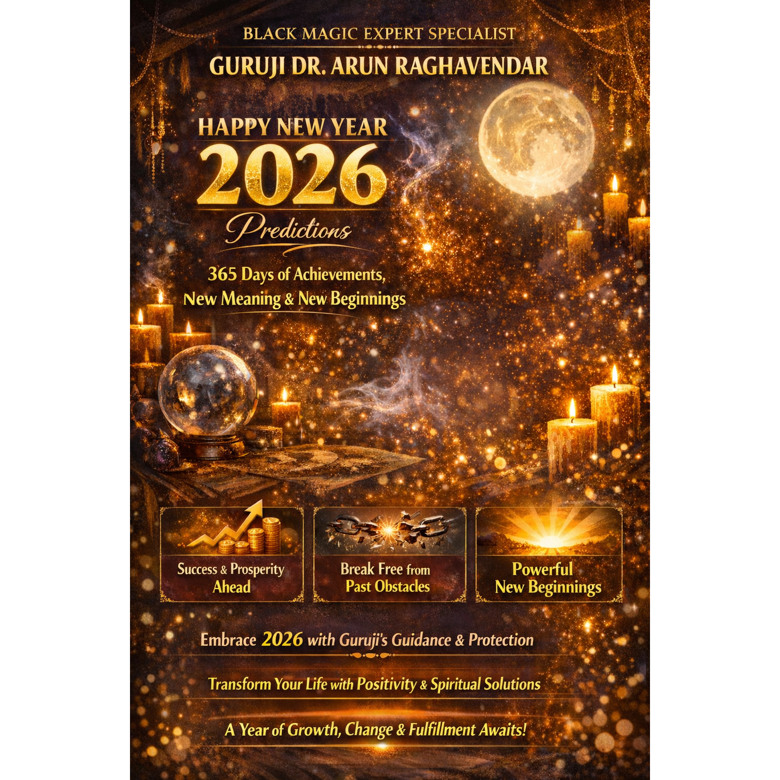 Happy New Year 2026 Predictions by Black Magic Expert Specialist Guruji Dr. ARUN RAGHAVENDAR. New Year 2026 with hope, power, and positivity under the divine guidance of Black Magic Expert Specialist Guruji Dr. ARUN RAGHAVENDAR, a trusted name in occult sciences, spiritual healing, and negative energy removal. His Happy New Year 2026 predictions reveal that the coming year brings 365 days of achievements, growth, and transformation, opening doors to new opportunities in career, business, relationships, and personal well-being. With his deep knowledge of astrology, prasannam, and mystical sciences, Guruji provides clarity and protection against hidden obstacles and negative influences. According to Guruji Dr. ARUN RAGHAVENDAR’s 2026 predictions, this year carries new meaning and powerful new beginnings. It is an ideal time to break free from past failures, black magic effects, evil eye problems, and unexplained hurdles. His spiritual remedies and occult solutions help align your destiny with success, peace, and prosperity. Those facing delays, losses, or mental stress can experience relief and renewed confidence with proper guidance and divine remedies. Start New Year 2026 with positivity, protection, and purpose. With the blessings of Black Magic Expert Guruji Dr. ARUN RAGHAVENDAR, your life can move toward happiness, stability, and long-term success. Let this year be a journey of achievement, inner strength, and fresh beginnings, where every day brings progress and fulfillment. Trust his expertise to make 2026 a powerful and problem-free year for you and your family.