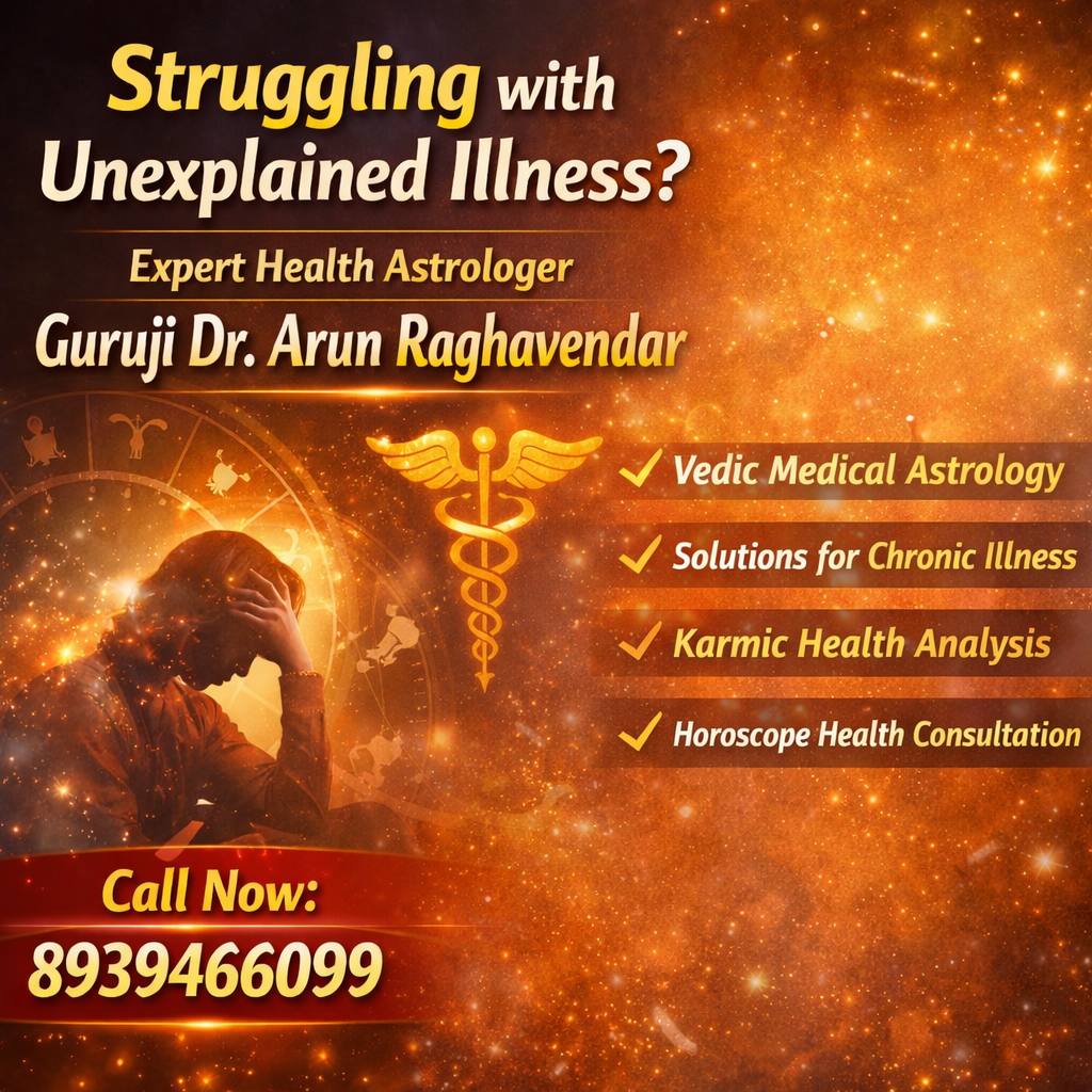Health Astrologer in India – Solve Hidden Health Problems with Guruji Dr. Arun Raghavendar (Call 8939466099). Are you facing health issues that doctors can’t fully explain? Repeated illness, stress, or unexplained weakness often goes beyond physical causes. This is where health astrology reveals the deeper truth. Guruji Dr. Arun Raghavendar, one of India’s most trusted Vedic Health Astrologers, helps you uncover the real root cause of your health problems — whether it’s planetary imbalance, karmic influence, or negative energy patterns. Unlike traditional treatments that focus only on symptoms, Guruji provides soul-level healing guidance using powerful Vedic astrology techniques. Why Health Astrology is Powerful in Modern Times Today, many people suffer from chronic issues despite medical treatment. Health astrology bridges the gap between science and spirituality, offering clarity where reports fail. With precise horoscope analysis, Guruji identifies: Hidden health risks before they become serious Emotional and karmic triggers behind illness Planetary doshas affecting your physical and mental health This allows you to take preventive action and regain control over your life. What Makes Guruji Dr. Arun Raghavendar Different ✔ Deep Horoscope Diagnosis Analysis of key houses (1st, 6th, 8th, 12th) to detect health weaknesses early ✔ Solutions Beyond Medicine Personalized remedies like mantras, gemstones, fasting, and spiritual practices ✔ Clarity for Chronic Problems Understand why treatments fail and discover hidden causes ✔ Auspicious Timing (Muhurta) Choose the best time for surgeries, treatments, or recovery ✔ Holistic Healing Approach Balance body, mind, and energy for long-term wellness Who Should Consult a Health Astrologer? People suffering from chronic or recurring illnesses Those with stress, anxiety, or unexplained health issues Individuals facing sudden health setbacks Anyone seeking preventive health guidance through astrology Take Control of Your Health Today Don’t ignore the deeper signals your body is giving you. When modern medicine reaches its limits, Vedic health astrology opens new possibilities. 📞 Call Now: 8939466099 Connect with Guruji Dr. Arun Raghavendar and discover a powerful, holistic path to healing and protection. Health astrologer India | Vedic health astrology | medical astrology expert | astrology for health problems | chronic illness astrology solution | horoscope health analysis | karmic disease astrology | best astrologer for health | spiritual healing astrology | health astrology consultation India